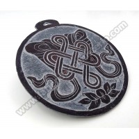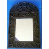 Espejo realizado en madera con relieves celtas y detalle de triqueta en su parte superior....