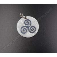 Colgante de acero plateado incrustado en nácar con trisquel.Símbolo celta que representa los tres...