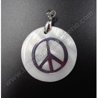 Colgante de acero plateado incrustado en nácar con el símbolo de la paz. Promueve la paz...
